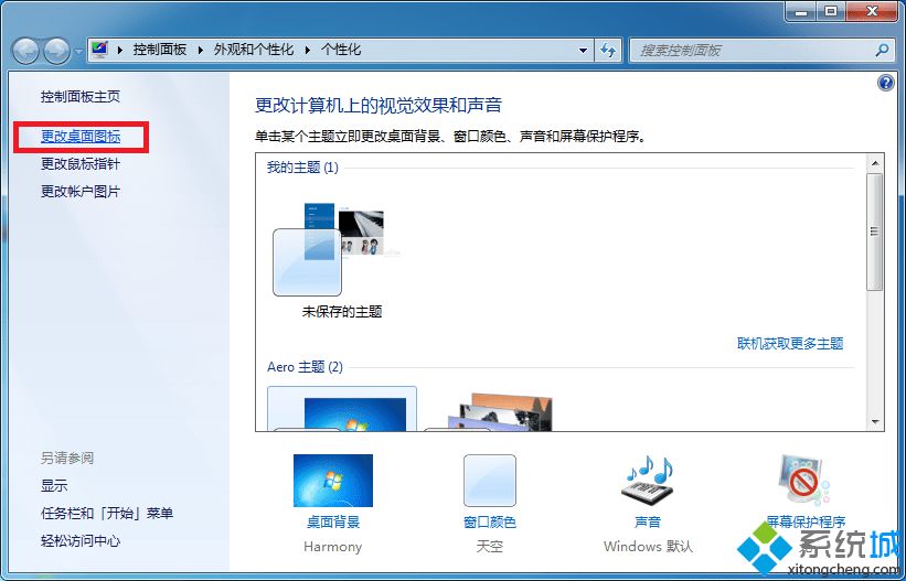 2、 进入个性化窗口后,点击左侧的更改桌面图标,如图所示;