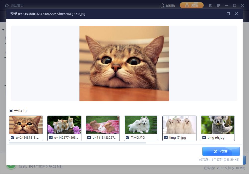 扫描结束后, 您通过预览的方式检查修复的照片质量。软件支持提取和提升已选图片的缩略图质量