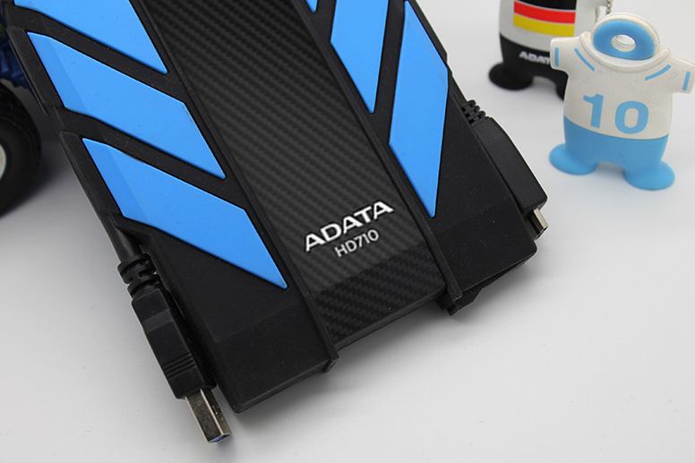 防止移动硬盘摔坏的办法推荐,最有效地方法就是做防摔的外壳。威刚这款具有三防性质的HD710P在体积上比传统的机械移动硬盘并没有小太多,但是它和三防手机一样做了一层特殊的壳子。